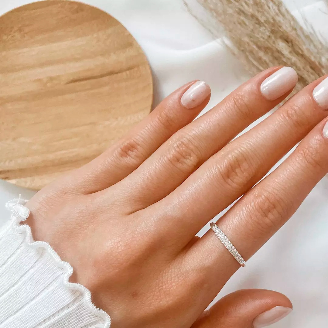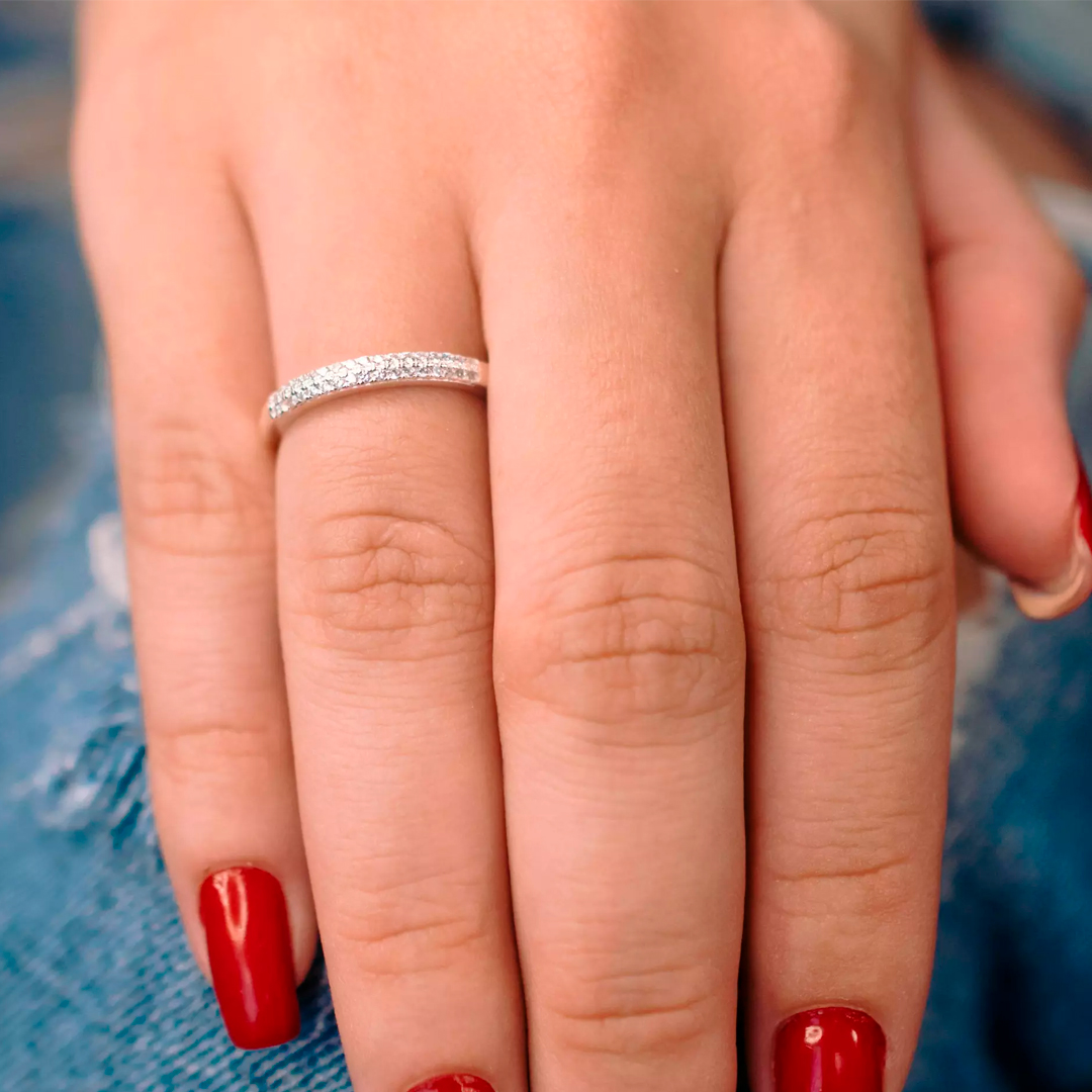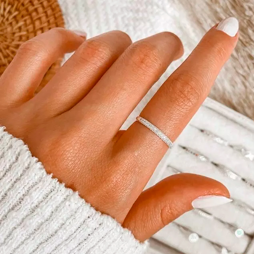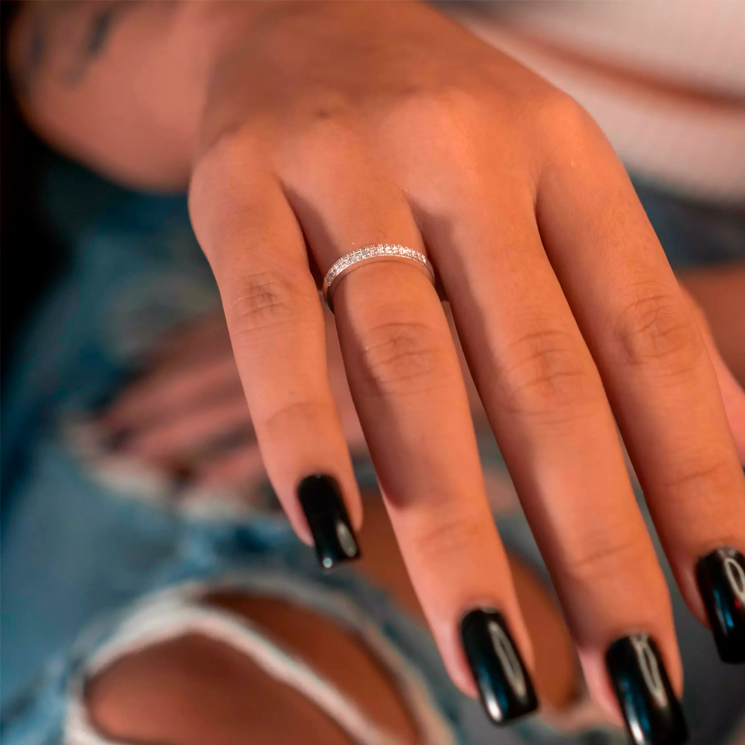 Anel aparador meio cravejado com duas fileiras de zircônias.