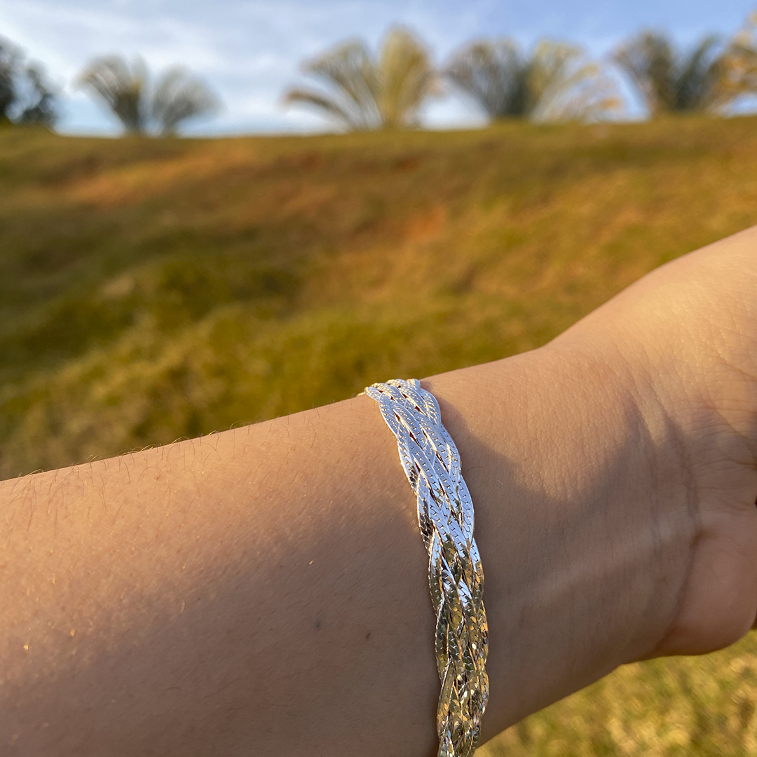 Dê um toque de elegância ao seu pulso com esta bela pulseira de prata. Esta pulseira apresenta 5 fios que são traçados com delicados detalhes prateados. É a peça perfeita para dar um toque de glamour a qualquer roupa.